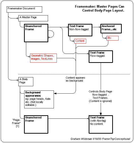 [2] Unanchored Frames can contain other Unanchored Frames -- ie: they can be nested. In fact they can only be nested, as there is nowhere else to place an Unanchored Frame. (Note that where I have drawn direct or indirect loops on this diagram the meaning is this: a particular object may directly or indirectly contain other objects of the same type, but, as is probably obvious, it is prohibited from containing itself!)